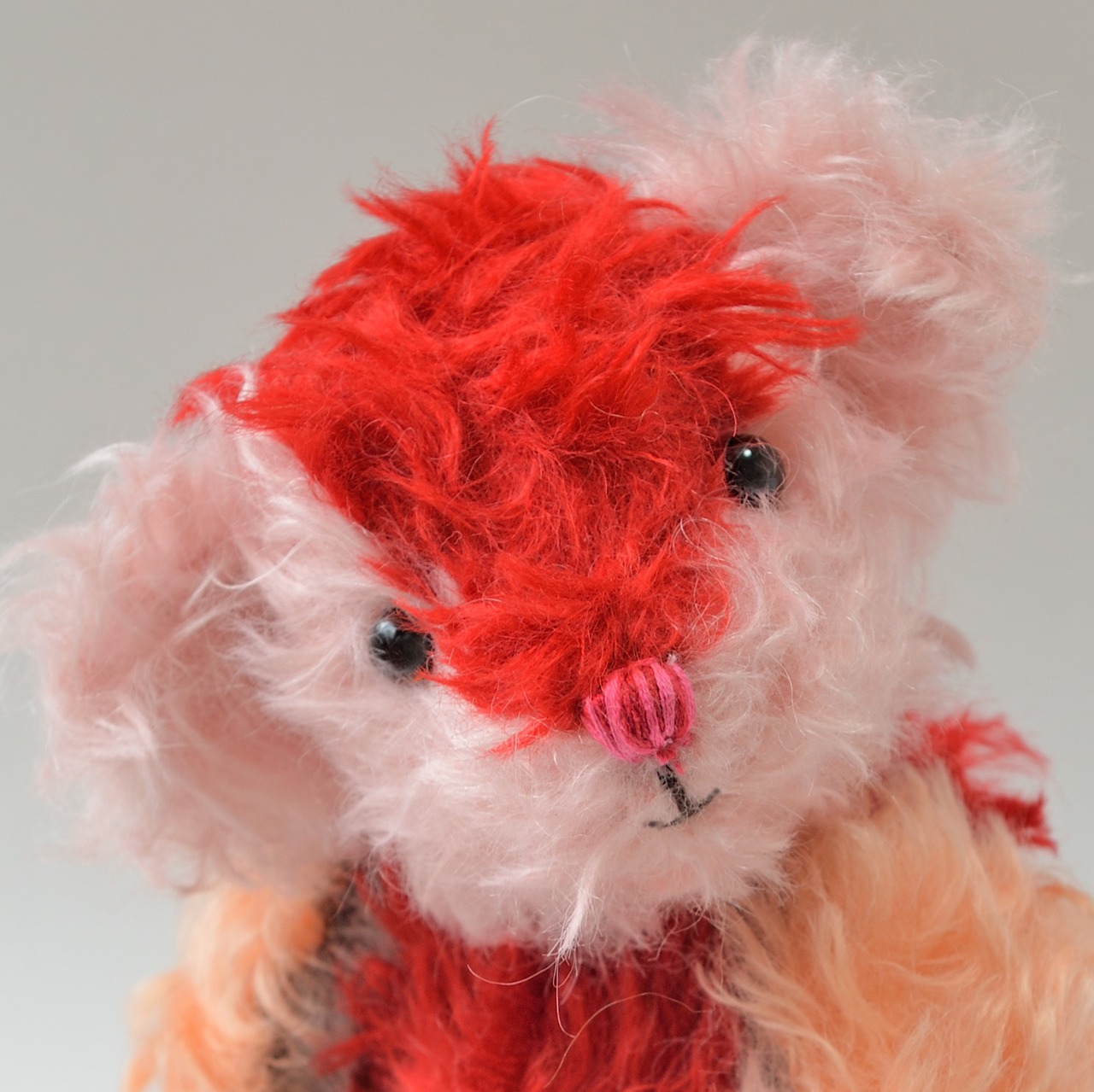 このテディベアはきれいな赤色のモヘアと様々なかわいい色のモヘアの組み合わせによりアート感のあるクラシックテディベアです。