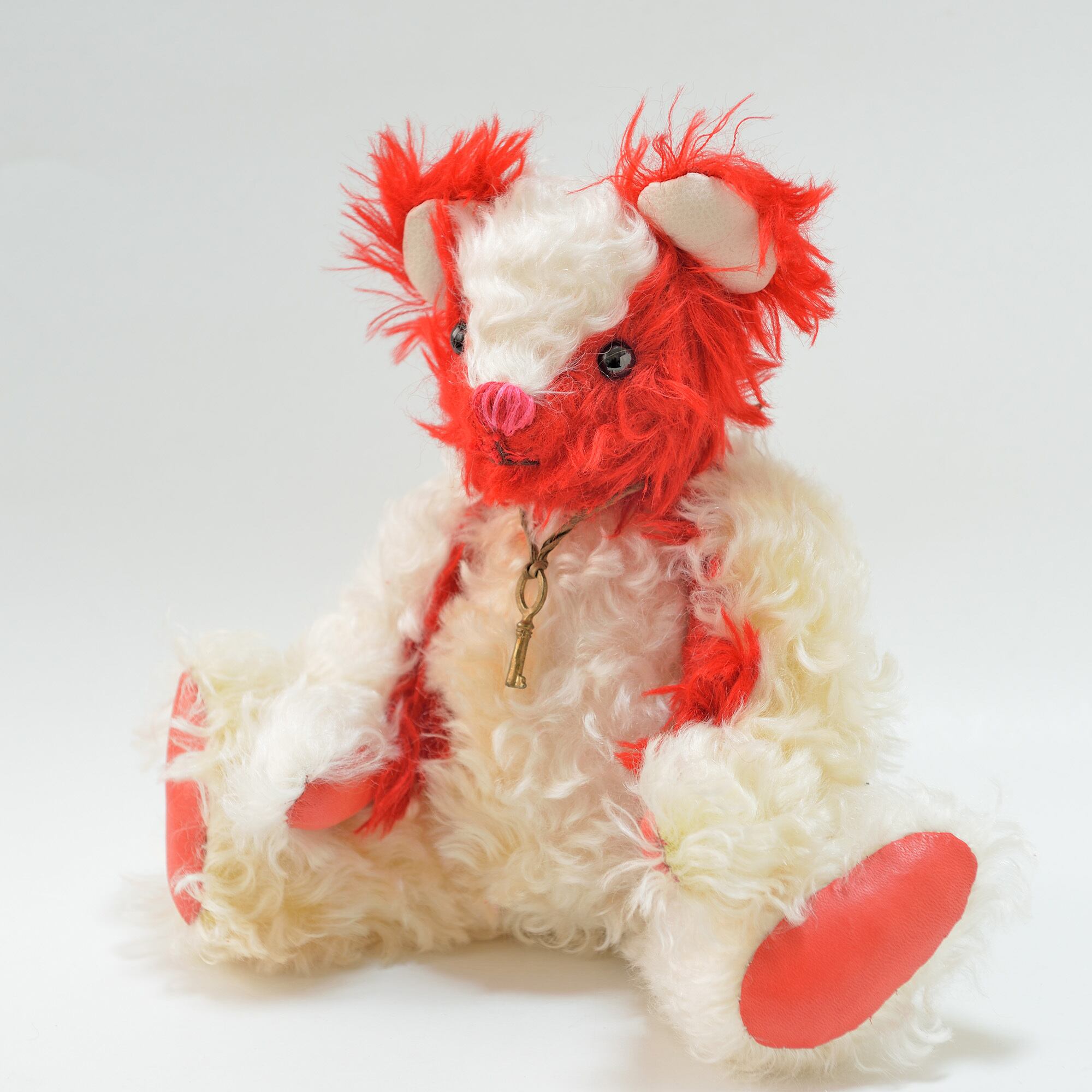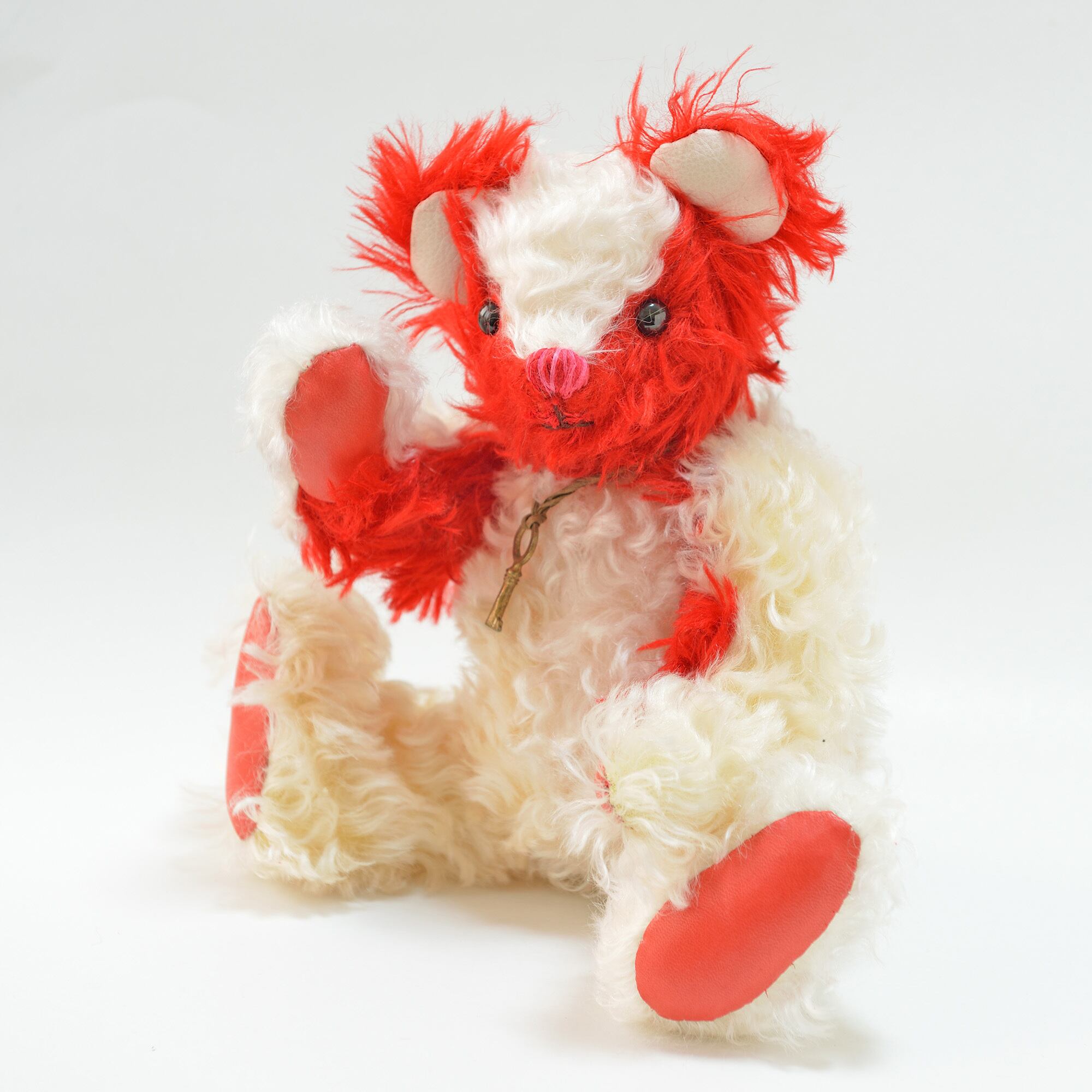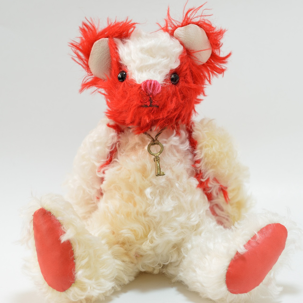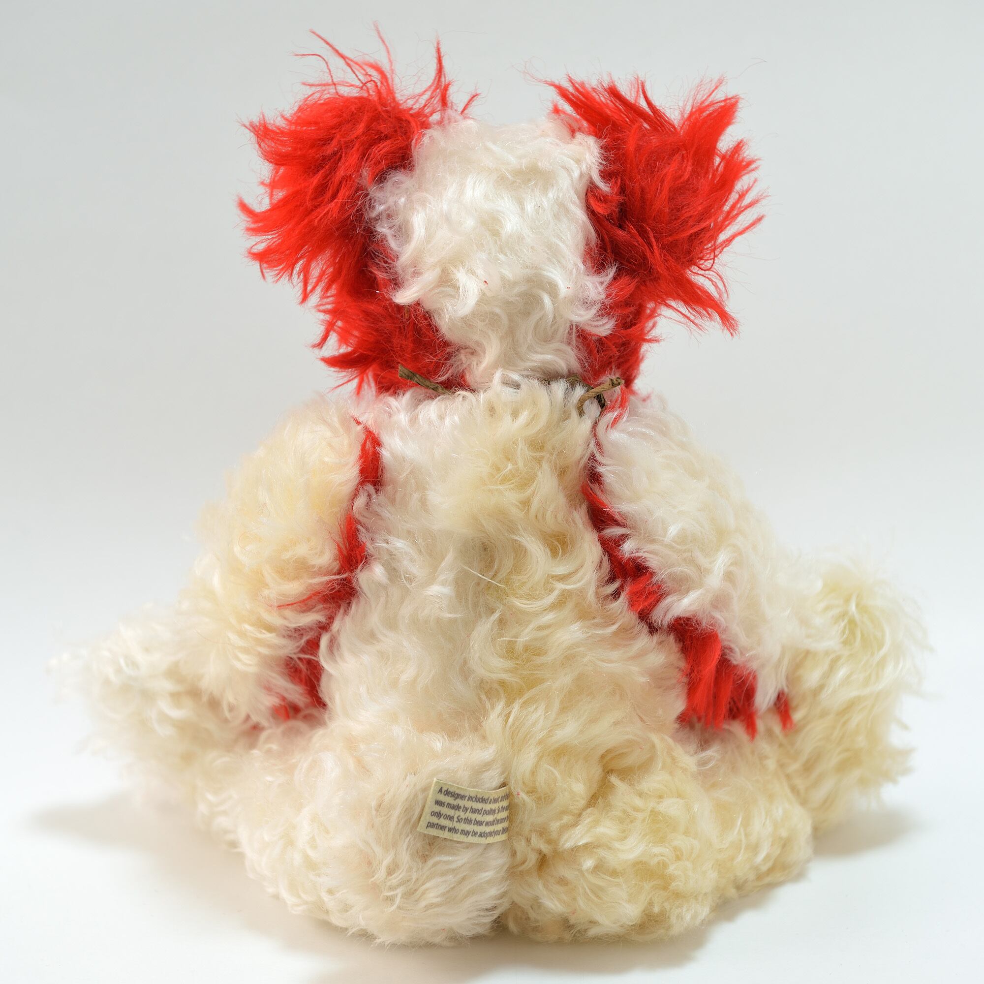 全体的には毛足の長いホワイトのモヘアを使用し、お顔、腕の内側に発色の良い鮮やかなレッドのモヘアを使った美しいコンビネーションです。