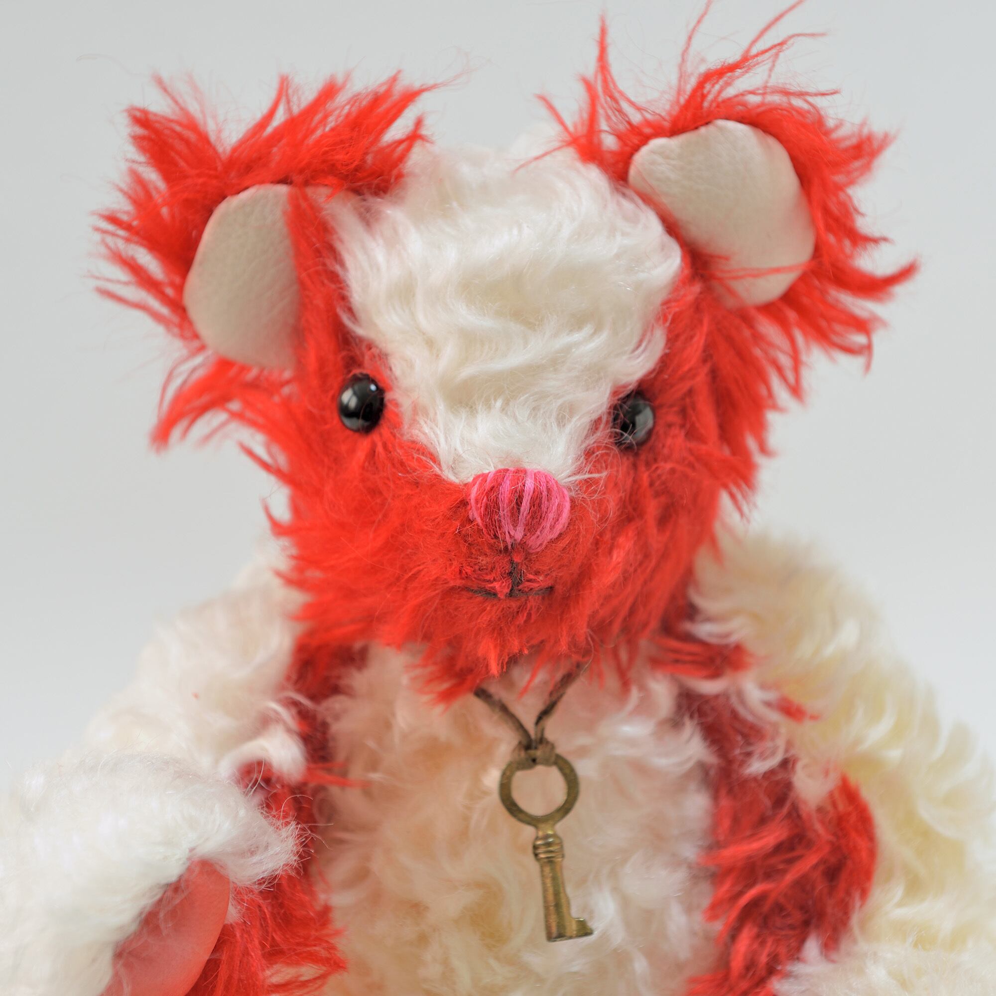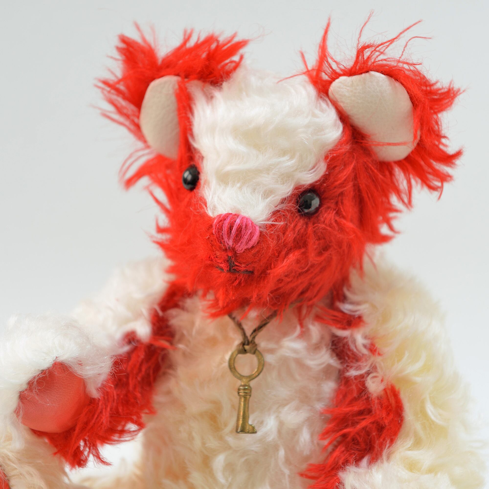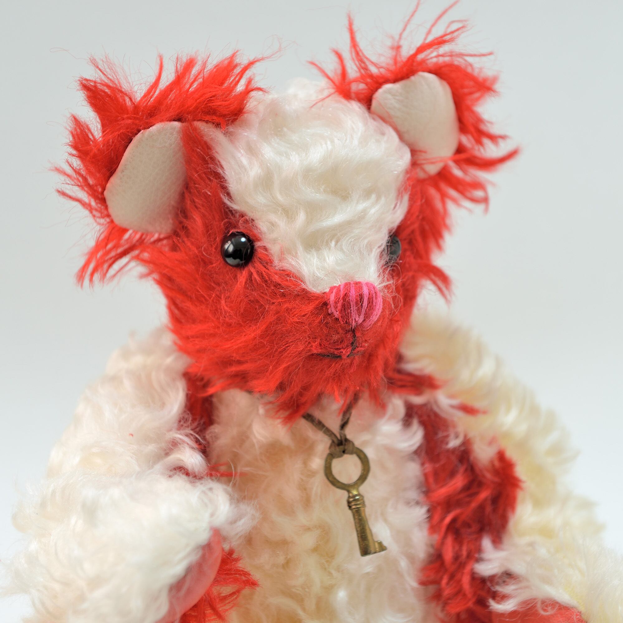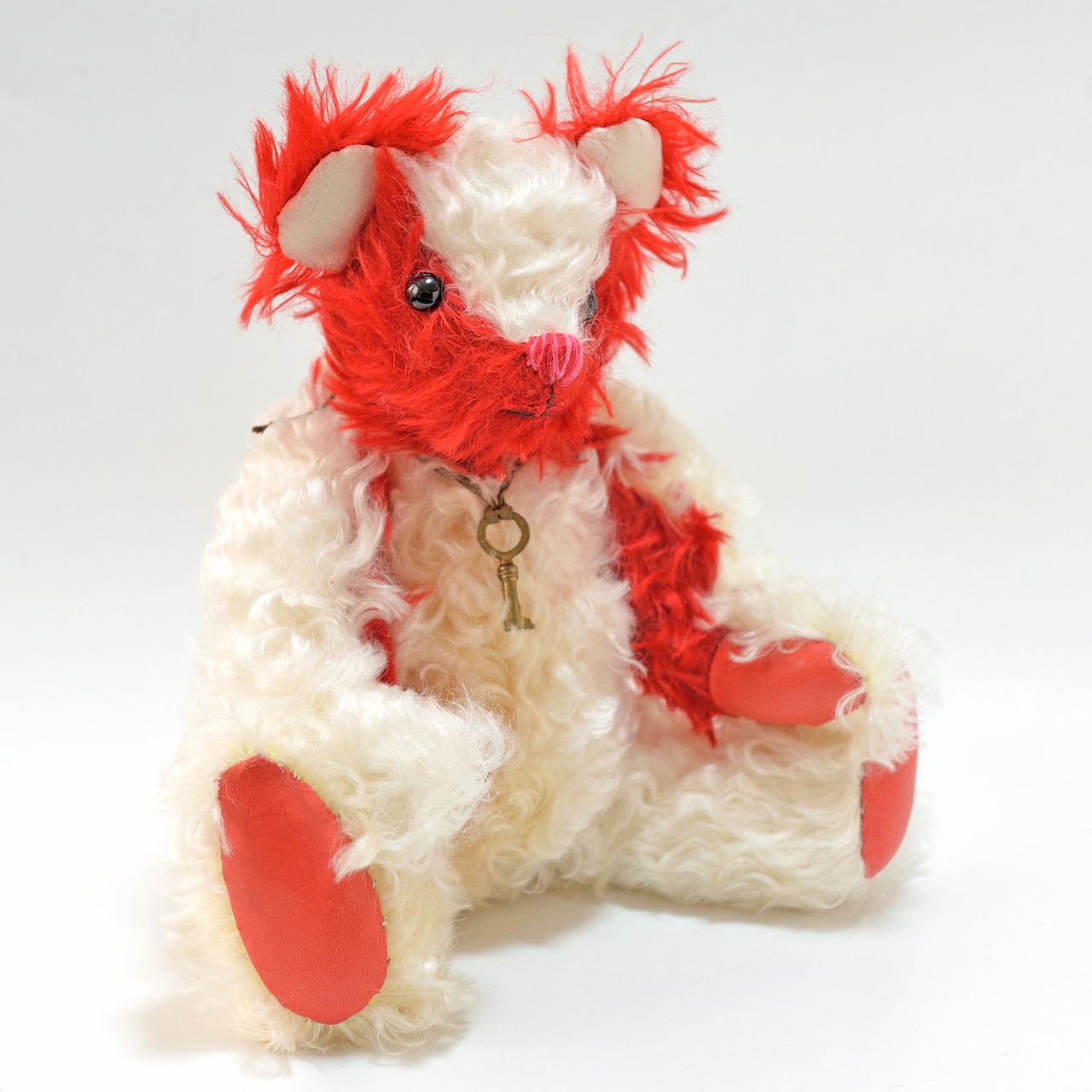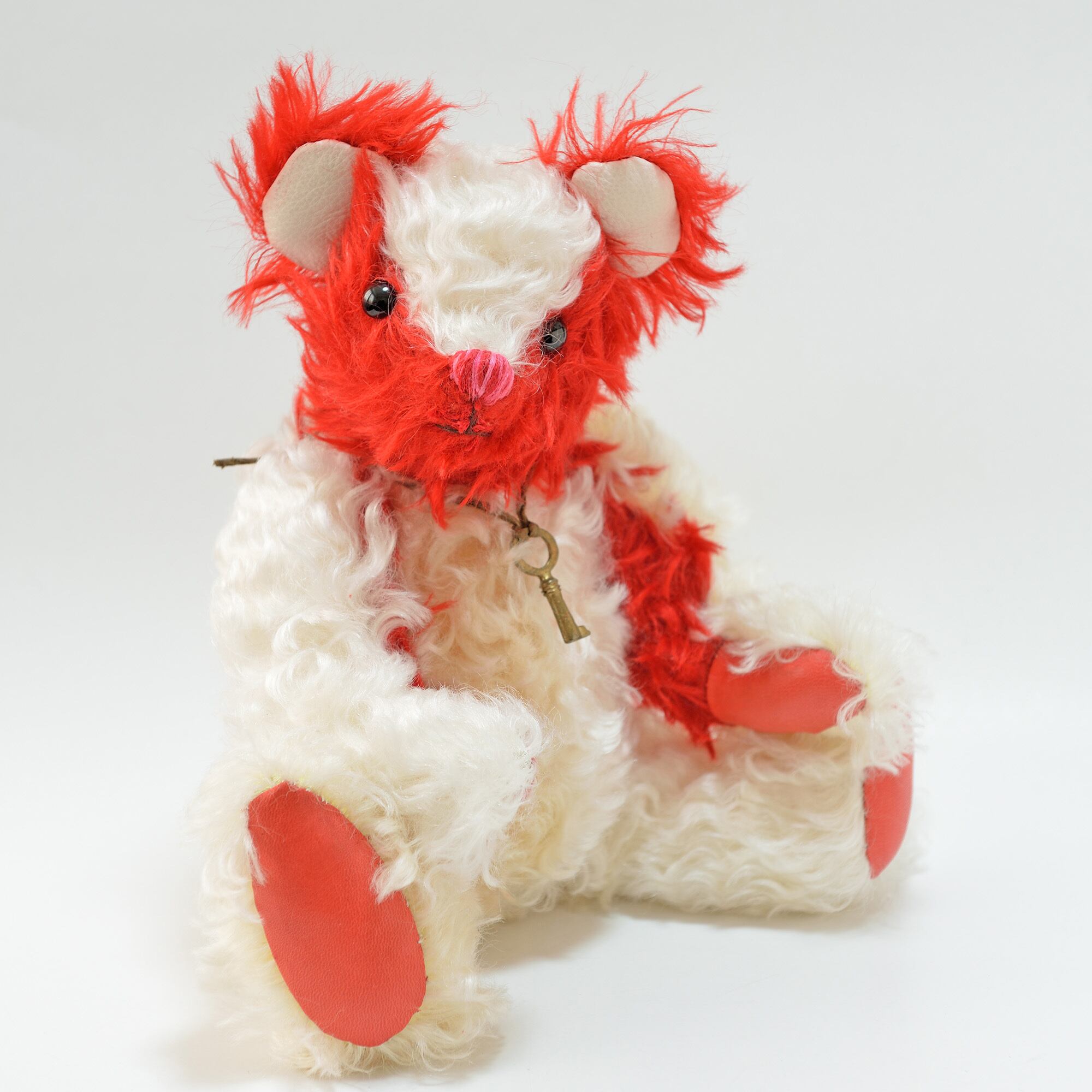 全体的には毛足の長いホワイトのモヘアを使用し、お顔、腕の内側に発色の良い鮮やかなレッドのモヘアを使った美しいコンビネーションです。